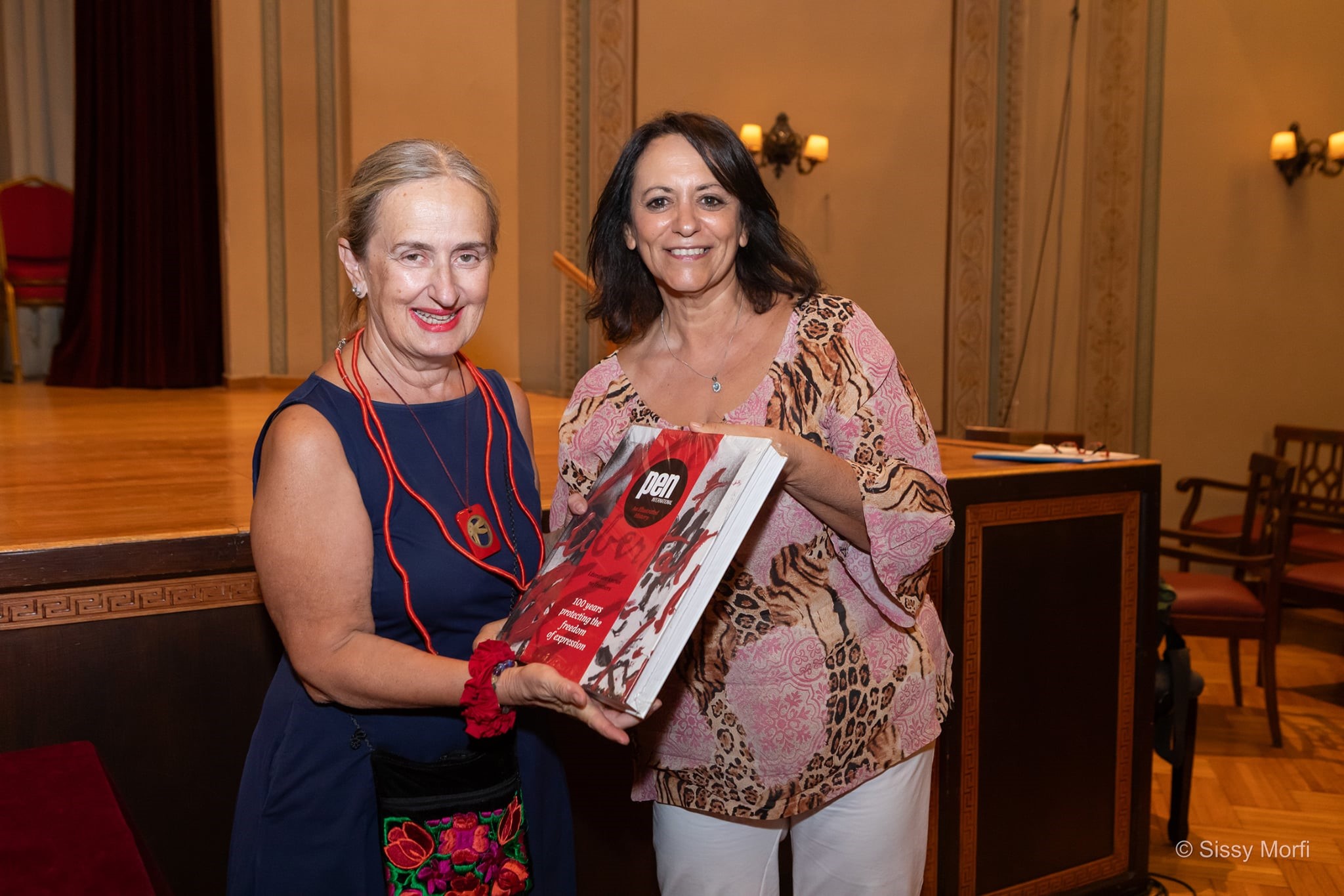 Η Πρόεδρος του PEN Greece, Τέσυ Μπάιλα παραδίδει στη Διευθύντρια Γραμμάτων του ΥΠΠΟ και Εκπρόσωπο του PEN Greece στο PEN Balcan Circle την επετειακή έκδοση του PEN International για τα 100 χρόνια από την ίδρυσή του στην αίθουσα του Φιλολογικού Συλλόγου Παρνασσός. Φωτό: Σίσσυ Μόρφη